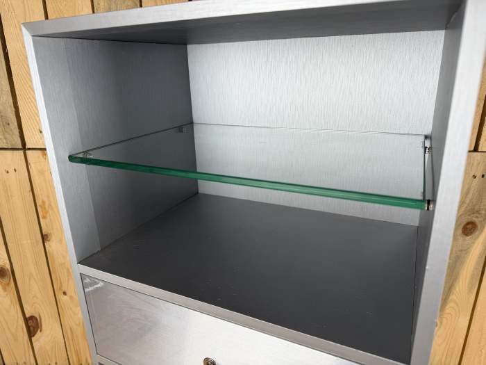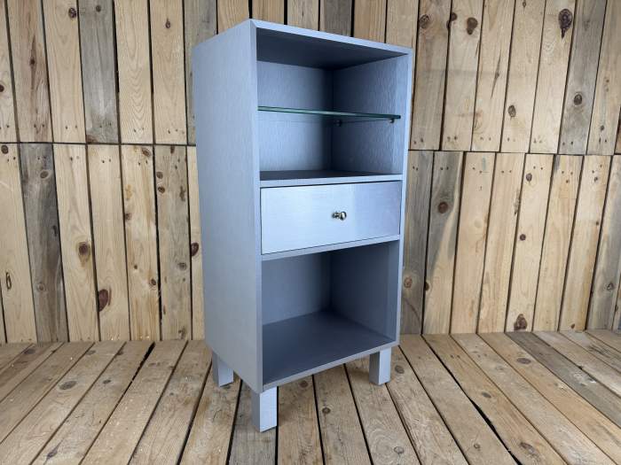 Armario auxiliar estrecho en color gris, ideal para baño, recibidor o espacios reducidos. Medidas aproximadas 80 × 40 × 20 cm. Dispone de balda superior con estante de cristal, un cajón central con tirador metálico y un compartimento inferior abierto, ofreciendo almacenaje práctico y ordenado. Diseño moderno y neutro, estructura estable con patas elevadas, fácil de combinar en cualquier ambiente. En muy buen estado, limpio y listo para usar. Mueble auxiliar, armario baño, mueble estrecho, armario pequeño, mueble con cajón. WD2410110832