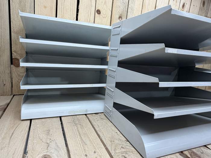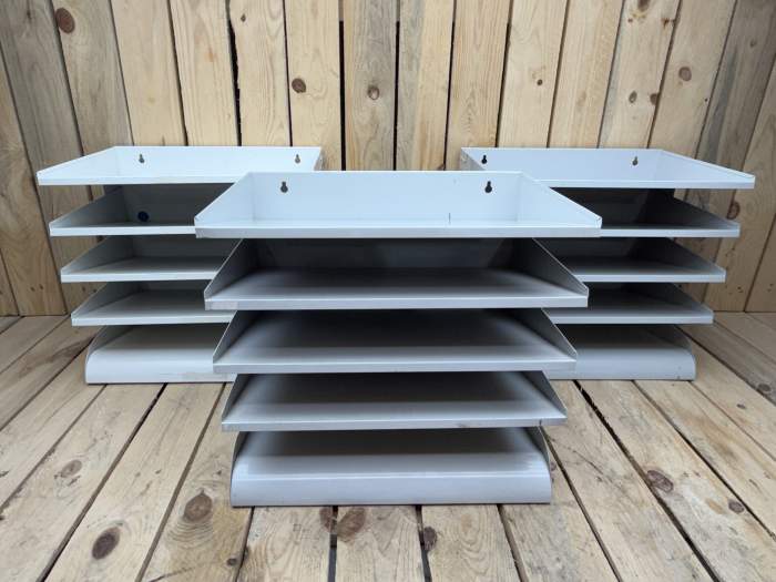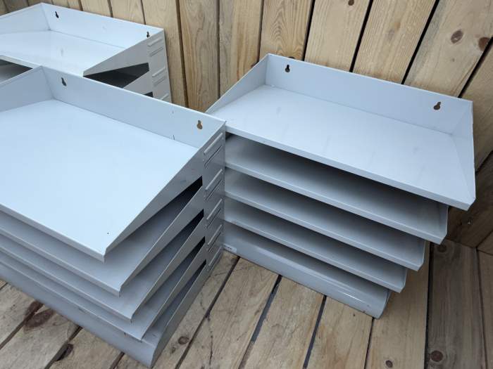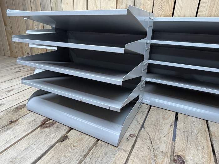 PRECIO UNITARIO. Bandeja/estantería metálica de oficina en color gris, ideal para organización de documentos, carpetas, material de oficina o almacén. Estructura robusta y resistente, preparada para fijación en pared o uso en mesa. Procedente de cierre de oficina. Varias unidades disponibles iguales a las mostradas, ideal para equipar despachos, archivos o zonas de trabajo. WD2512311206
