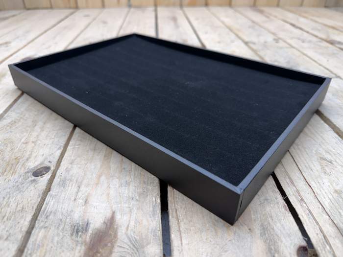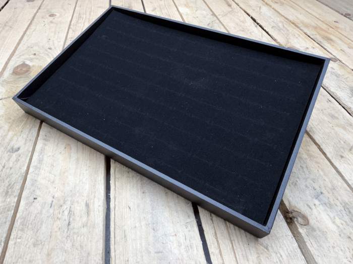 Bandeja expositora de bisutería forrada en terciopelo negro, ideal para joyería, relojería, ferias, mercadillos o vitrinas. Procedente de cierre de joyería. Perfecta para anillos, collares, pulseras o pequeños accesorios, con acabado elegante y profesional. En buen estado general, tal como se aprecia en las fotos. Varias unidades y varios modelos disponibles, posibilidad de venta individual o en lote. WD2512311204