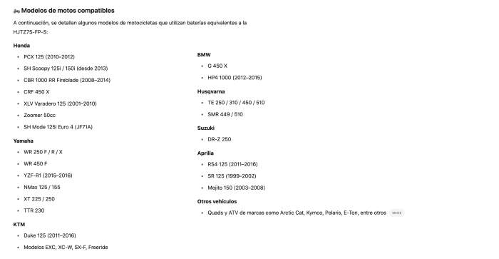 Batería HJTZ7S‑FP‑S nueva (12 V/6 A 150 CCA, solo 0,6 kg y 113×70×85 mm). Compatible con modelos que usan YTZ7S‑BS/HJTZ7S‑FP‑S: Aprilia Mojito 150 (03‑08), RS Replica GP IE LC Euro4 125 (17‑18), RS4 125 (11‑16), SR 125/150 (99‑02), SX4 125 (18‑19), Tuono ABS 125 (17‑18); Benelli BN251 ABS (17‑18); Betamotor Alp 4T 200 (03‑07); BMW G SMR 450 (09‑10), G X 450 (08‑12); Derbi Boulevard 150/200 (03‑12), GP 1 50, Mulhacen 125, Senda Cross City/R/Baja (04‑13); Husqvarna TE 250/300 4T (03‑13); y también Honda CRF110F, CRF125F, Kawasaki KLX110 y KTM 125 XC actuales. LiFePO₄ AGM, batería sellada con indicador de carga. Envíos 24/48h. WD2412091727