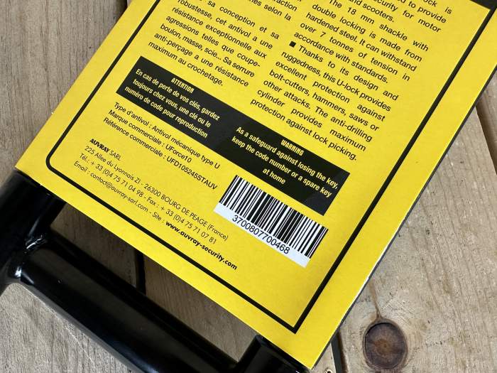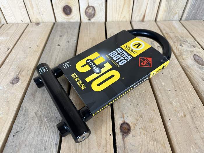 Candado antirrobo Auvray FORCE U10 con arco en U de acero cementado de 18 mm, mango reversible y doble sistema de bloqueo. Medidas: 105x245 mm. Alta resistencia frente a ataques y cortes. Seguridad fiable para tu moto o scooter. Más candados, cascos, ropa y accesorios en nuestro perfil. Envíos 24/48 h. WD2412171106 3700807700468 aceite motor grasa cadena embrague freno dot motul ipone castrol airoh givi stormer scorpion acerbis enduro motocross