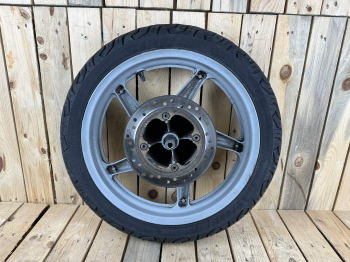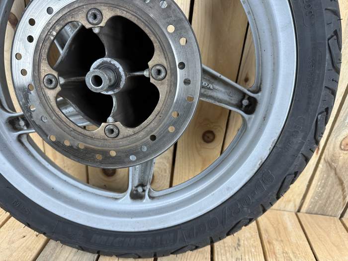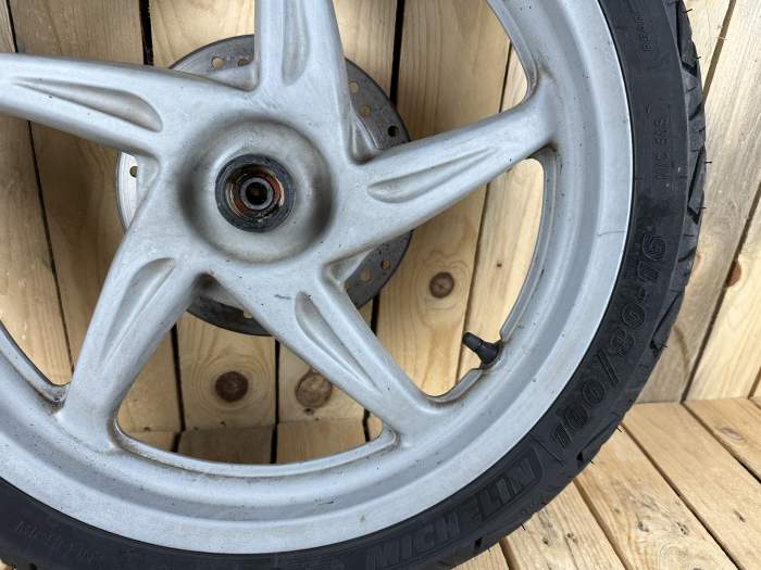 Rueda delantera completa con neumático y disco de freno en perfecto estado, lista para montar y rodar muchos kilómetros sin necesidad de cambiar goma. Para ver todas las piezas disponible de este modelo ponga en el buscador "SH125 2005". HD05SH12500012