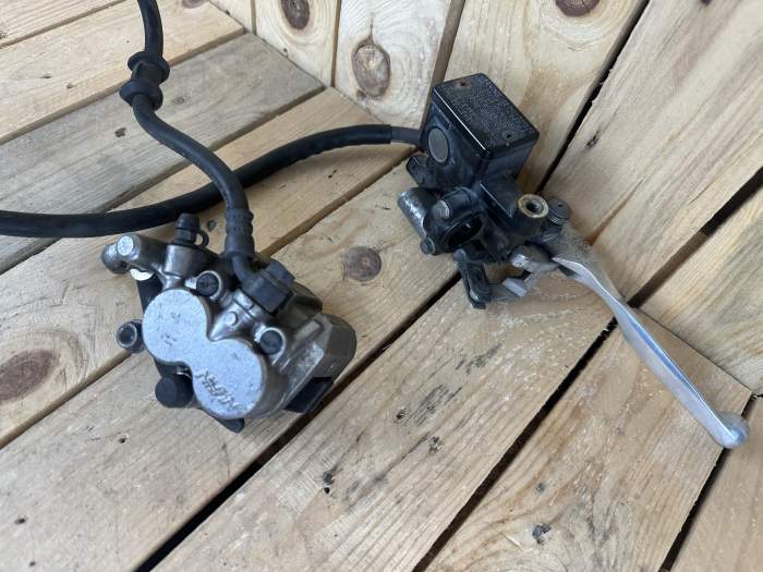 Sistema de freno delantero completo de Honda SH125 del 2005, compuesto por bomba, maneta, latiguillo y pinza Nissin original. Para ver el despiece completo de esta moto ponga en el buscador "HD05SH125". En buen estado de funcionamiento, tal y como se aprecia en las fotos. Piezas válidas para otros años (asegurarse). Envío disponible. HD05SH12500006