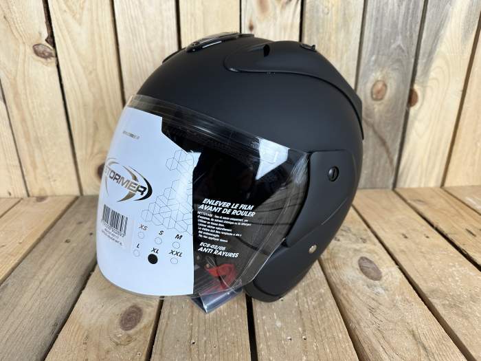 Casco jet Stormer Sun Evo en color negro mate, talla XL. Equipado con pantalla transparente antiarañazos, ventilación frontal y cierre micrométrico de trinquete. Última unidad disponible, sin caja. Disponemos de más tallas (XS a 2XL) y una amplia variedad en cascos, ropa, protecciones y accesorios para moto. Consulta nuestro perfil o pregúntanos directamente. Envíos 24/48h. WD2302281650