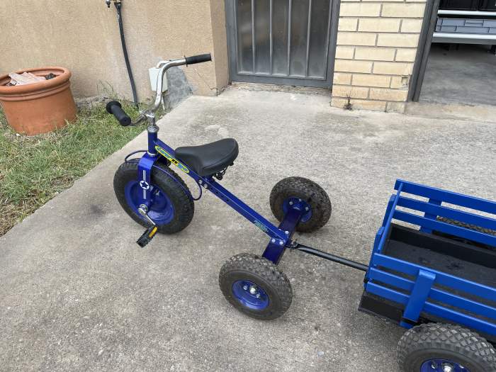 Descripción: Triciclo con remoque infantil procediente de cierre de tienda que estaba en la exposicion. Ideal para dar paseos o para llevar cosas en el remolque. Puede ir por todos los terrenos. Ruedas con cámara de aire. Se puede ir con o sin el remolque.